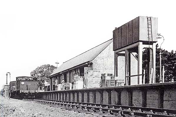 Copyright photo from John Alsop collection ![]() A rare view of a tender locomotive on the Fawley branch, an unidentified Adams Class A12 0-4-2 on a goods train in June 1948. Known as 'Jubilees' because they were introduced in the year of Queen Victoria's Golden Jubilee, 1887, it was one of this class, No.605, which was involved in the 1926 accident at Frost Lane level crossing when it destroyed a Wolseley motor-car. Withdrawal of the class began in 1928 and during WWII several of the survivors, along with members of other classes, were used as makeshift air-raid shelters by the simple expedient of placing them over inspection pits at various sheds and workshops. Forty of the class were built by Neilson & Co and were officially Class O4. They had a number of differences to the A12 but the whole lot were, probably for convenience, lumped together under the A12 banner. The class was a rare example, in Britain, of the 0-4-2 tender type. Just four survived to see British Railways but the class became extinct during 1948 with none ever receiving a BR number and it is likely none were even allocated. On the platform at Hythe, a large number of crates are stacked. Presumably they await loading, or have been unloaded from, a passenger train although a number of them appear to be empty. No close-up photographs of Hythe's water column are known to exist but this one offers a reasonable view. The upper part appears to be quite ornate. We are also offered a reasonably close view of the water tower with its typically Southern concrete base. Both items disappeared quickly following the end of steam on the branch.