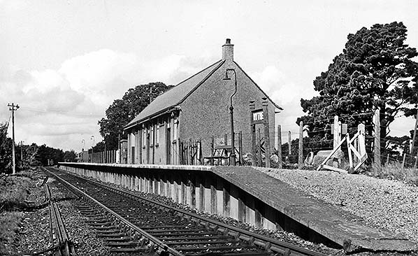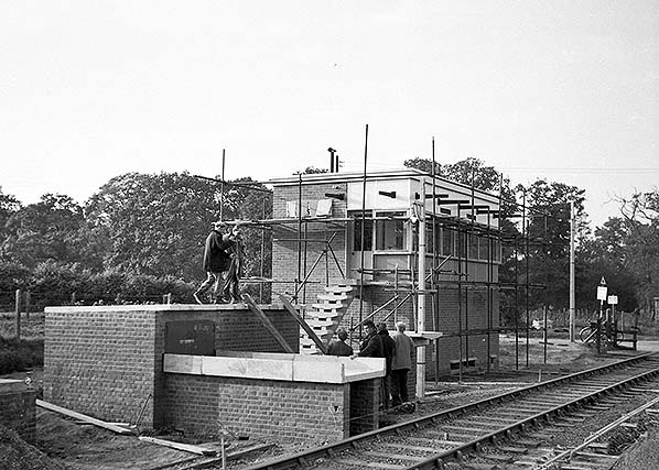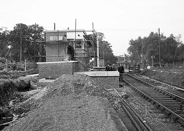 Photo from John Mann collection ![]() Frost Lane Crossing signal box under construction in 1961. In comparison with the close-up view of the level crossing, we can see a signal has appeared while, right, signal wires and point rodding are in place. In the background, facing the siding and partly visible to the right of the signal is a shed or cabin of some description. Frost Lane Crossing was to receive lifting barriers, presumably operated from the signal box. Behind the camera were the up and down loops, each being provided with spring-operated trap points and with points at the convergence and divergence of the loops being motor-operated. The rodding on the right is linked to the box beneath the track and via the low brick structure ahead of the camera. The rodding route is both towards Fawley and Hythe; some will operate the points to the siding with the others probably being for facing point locks at the loops. Apparently this box also unlocked Hythe East and West ground frames, i.e. to Hythe dock and goods yard. For the job intended of it, Frost Lane Crossing box was a quite large structure. What looks like workmen’s clothes hanging out to dry on the end wall of the box are in fact sheets of something covering the nameplate. On this end of the box the nameplate was mounted as seen. On the other end, the end windows extended the full depth of the box and part way around its rear to provide a good view of the crossing and road. On this end, therefore, the nameplate was mounted below the windows. In both cases the name was presented on two lines; Frost Lane at the top and crossing at the bottom with, it would seem, black lettering on white background. The steps up to the box were on this end of the building and had yet to be completed when this photograph was taken. Southampton Water is but a short distance to the right of this view and Frost Lane is a continuation of Shore Road. Today Frost Lane crossing is AHB (Automatic Half Barrier), as are other formerly ungated crossings on the line. The box has gone and, with woodland having now encroached up to the lineside, there is no obvious evidence that the box ever existed.