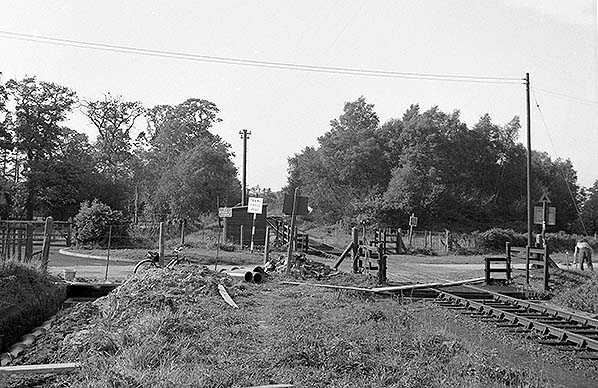 Photo by Ron Fisher from his Flickr photostream ![]() Frost Lane level crossing with work ongoing in connection with the new signal box in 1961. This crossing, one of a few ungated crossings on the Fawley branch, was the epitome of a Light Railway 'economical' level crossing and it is surprising that upgrading did not occur until the 1960s. The work seen ongoing was in connection with the new Frost Lane Crossing signal box. A workman can be seen on the right and he has wheelbarrow planking across the track. Various signs from a bygone age can be seen dotted around the crossing; 'SR Beware of Trains' trespass warnings plus two of the old style 'Trains Cross Here' road traffic signs with warning triangles containing what we used to call 'fruit gum' reflectors. It is known, perhaps obviously so, that the road approaches to Frost Lane Crossing also had the pre-Worboys ungated level crossing signs which depicted a representation of a steam locomotive in silhouette and again with warning triangle and 'fruit gums'. These signs are out if view in this photograph. It is interesting to note that to this day modern ungated railway (as opposed to tramway) level crossing warning signs still depict a steam locomotive. On the other side of the level crossing and to the right of the hut can be seen a 'T' sign. These were illuminated during the hours of darkness and indicated the end of a temporary speed restriction. There is another sign opposite and facing the other way; this will be a commencement of speed restriction sign and advanced warnings would have been positioned further along the line. These signs are still in use today albeit in modern form. The purpose of the hut and, indeed, its origin is unclear. It may have been for the use of a flagman or, possibly, contained a ground frame for the points visible in the background but if the latter it would, one would have thought, been closer to the points. The points gave access to a single-ended siding, the purpose of which is unclear. The camera is looking towards Hythe and behind the camera was a loop. Signalling diagrams show it as 'Up Loop' and 'Down Loop' which in effect meant a short section of double track. Unsurprisingly the ungated crossings on the Fawley branch witnessed a number of mishaps. Staying with Frost Lane a collision between a car and train occurred at 3.21pm on 15 November 1926. The train was the 3.15pm goods from Fawley (a 'special' goods according to the subsequent Ministry of Transport Report) and the car, a Wolseley 10½hp open tourer. The car was destroyed but its occupants, an RAF officer who was driving, his wife, four year old daughter and an aunt were thrown clear by the impact and all survived. The locomotive was 0-4-2 tender No.605 and the train comprised eight empty goods wagons, six loaded petrol tankers and a brake van. Damage to the train was minor.