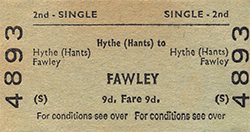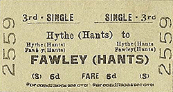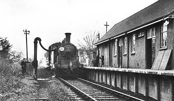 Photo from Waterside Heritage ![]() Drummond Class M7 0-4-4T No.30032 takes water at Hythe in January 1956. This locomotive was one the class known to have regularly worked the Necropolis train taking the dead and mourners to Brookwood Cemetery, described in a little more detail on the Fawley page. The provision of a water tower and column at an intermediate station on a fairly short branch may seem a little odd, especially when facilities were provided a short distance away at Fawley. The Fawley branch had a number of ungated level crossings and no locomotive turning facilities, therefore motive power in steam days was restricted to tank locomotives. The water tower at Fawley was away from the platform and adjacent to the refinery exchange sidings, so not always convenient for Southern and BR locomotives to use. Thus the facilities at Hythe were more convenient, at least from the staff point of view. During WWII Southampton was a Luftwaffe target and watering facilities at both Hythe and Fawley provided insurance should bombing effect this side of Southampton Water. Hythe's water tower and column, believed provided from the outset and certainly present in 1932, were removed following the end of steam on the branch. Visible on the station building are three Southern 'target' nameplates, the electric lights which illuminated them being difficult to discern.