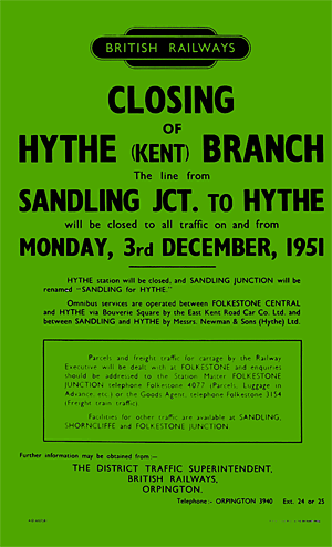 It was felt that there would be little hardship caused to the few passengers carried by the line as extra buses would be provided to take them to Sandling Junction or Folkestone Central. British Railways decided they could no longer justify keeping the line open for either goods or passenger traffic and closure was announced for 3 December 1951 with the last train running on Saturday 1 December. On the last day a large number of railway enthusiasts descended on the branch to ensure that it went out in style.