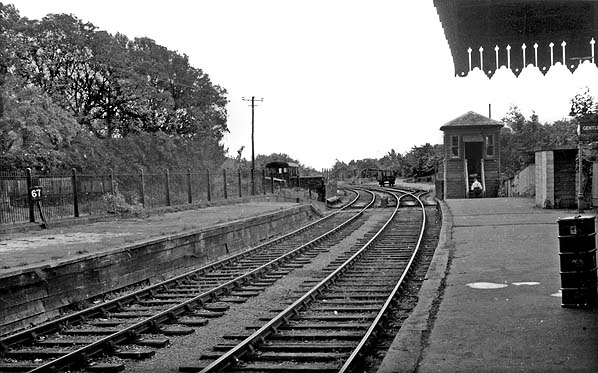 There was a signal box between the east end of the up platform and the approach road bridge controlled access to the goods yard to the east of the station, with sidings on both sides of the line. There were two sidings on the down side serving the coal yard and two sidings on the up side, from where there was a rail connection to the Hythe & Sandgate tramway.
