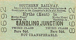 In 1933 rumours of closure were once again heard following the announcement that Sandling Junction was to be renamed 'Sandling for Hythe'; this prompted the Town Clerk to write to the Southern Railway stating that ‘a seaside town without a railway service was a very serious matter. Hythe is an important town and deserves an important train service!’. The SR once again denied that there were any plans to close the station and the summer timetable for 1934 had an enhanced service with nine additional trains (four up and five down) although the Sunday service remained as before with four in each direction. This level of service was maintained through the latter half of the 1930s with a renewed poster campaign promoting Hythe as the 'Pride of Kent'. By the end of the decade there were 12 trains to Hythe with 11 in the opposite direction. On Saturday this increased to 15 down and 14 up, whilst on Sunday 12 trains ran in each direction.