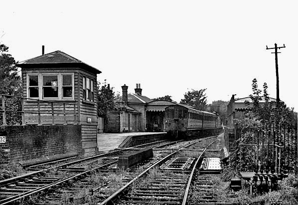 Looking north-west from the former down line towards Hythe station ion October 1951. A Sandling service is awaiting departure. The station road bridge is seen in the foreground with a ground frame, bottom right, for controlling access to the down side sidings.
