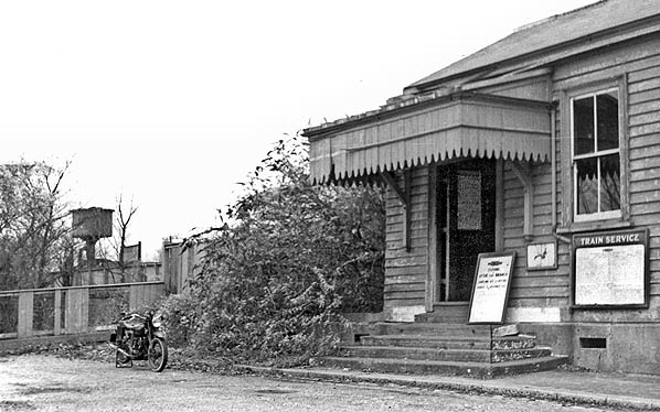Hythe station entrance c1950. The west end of the station building was destroyed when a German bomb hit the station during WW2. A buddleia bush quickly took root in the bombed-out parcels office.