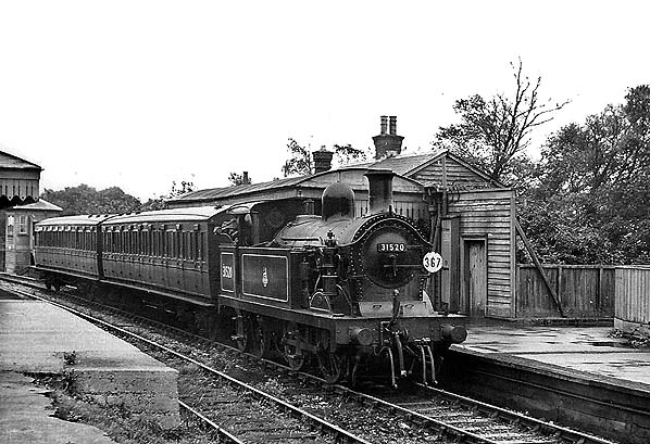A Sandling train waits to depart from Hythe station c1951. The remains of the bomb-damaged parcels office are on the right. Note the down platform on the left: some of the timber platform edging has been removed. 31520 is an H class 0-4-4T, built for the SECR in June 1909 at Ashford works. A design by H. Wainwright, it lasted until August 1960, when it was withdrawn from Tonbridge shed and scrapped a month later, probably at Ashford works.