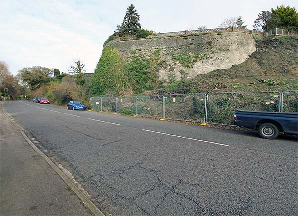 The huge retaining wall built into the side of the hill as seen in April 2014. The station approach road and goods yard were above at this point.