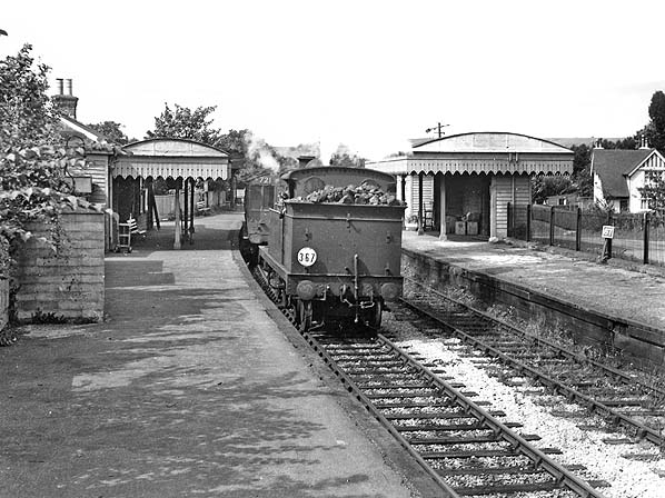 A Sandling Junction service waits to depart from Hythe station in August 1951. The old SER 'roader' parcels shed is seen on the left. A section of platform in front of the shed has been rebuilt in concrete indicating that the shed is still in use.