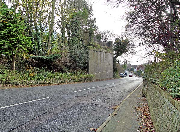 Looking south along Blackhouse Road towards Hythe at the massive bridge abutment in April 2014; the station was to the left