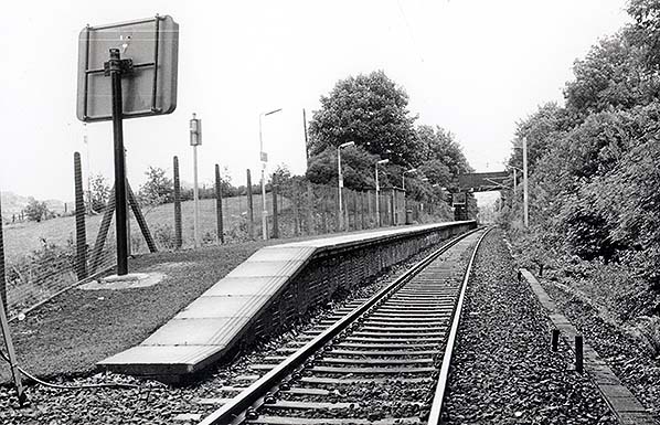 Photo by Alan Young ![]() Looking north-east towards IBM station in July 1988. the 'halt' suffix had been dropped in 1983. IBM can just be made out on the sign on the closest lamp post.