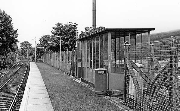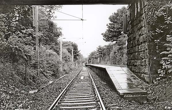 Photo by John Mann ![]() Looking south-west from beneath the accommodation bridge at the east end of the station in July 1988. The bridge dates from the opening of the Port Glasgow to Wemyss Bay line in 1865 and would have been used for moving livestock from the moors to the south of the line.