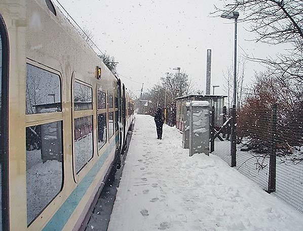 Photo by Thomas Nugent, reproduced from Geograph under creative commons licence ![]() A lone passenger alights from a Wemyys Bay bound EMU and trudges off through the falling snow towards the exit in February 2010.