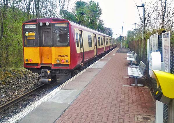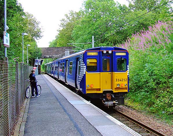 Photo by Mark Bartlett ![]() Refurbished Class 314 EMU No. 314212, in the new ScotRail saltire livery, pulls out with a service from Wemyss Bay to Glasgow Central in August 2011.