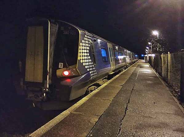 The penultimate train left Glasgow Central at 21.36. It is seen here at IBM on it's return journey from Wemyss Bay on 8 December 2018.