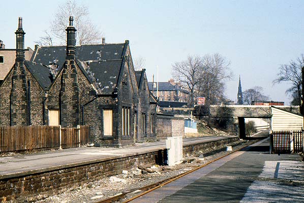 Looking north along the up platform in August 1979. Both the main building, forlorn and boarded-up, and the waiting shed are in place.