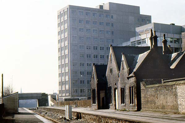 ![]() Looking south in August 1979 from the up platform, the bland concrete Scottish Life House contrasts strongly with the blackened bricks of the Gothic station building: a case of ‘dignity and impudence’? Photo by Alan Young