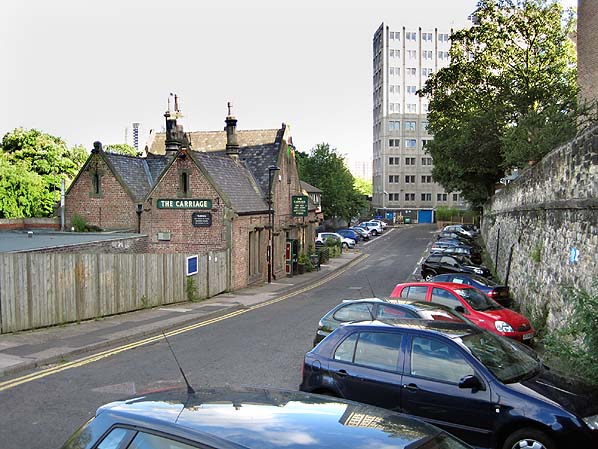Jesmond station building, looking south along the access road in July 2010; it is now