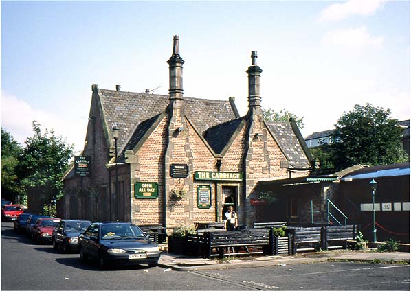 With its cleaned brickwork the former station building provides an attractive home for the ‘Carriage’ public house, seen here in August 1998.