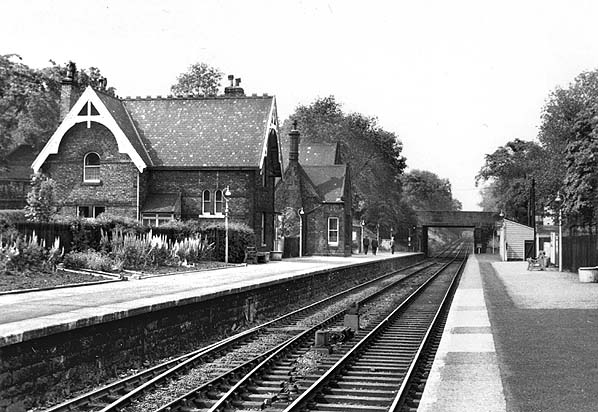 ![]() Jesmond station, looking north from the up platform in June 1969. The elegant Victorian buildings, dating from the 1860s, were intended to appeal to the affluent passengers who used this station. They would have recognised the station a hundred years later, so little had changed. The display of lupins is an attractive feature of the down platform, but in former years greater care was lavished on the floral displays at the station which regularly won ‘best kept station’ certificates. By 1969 diesel multiple units had replaced the electric trains and the electric third rails had been removed.