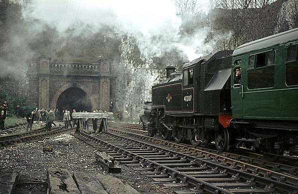 ![]() The RCTS 'Sussex Downsman' Railtour visited the terminus of the branch line to Kemp Town. Here, LMS Ivatt 2MT 2-6-2T No. 41287 faces the tunnel leading back to the main line before returning to Brighton on 22nd March 1964 Copyright photo by Geoff Plumb from his Plumb Loco web site ![]()