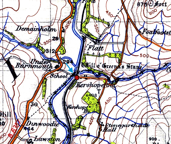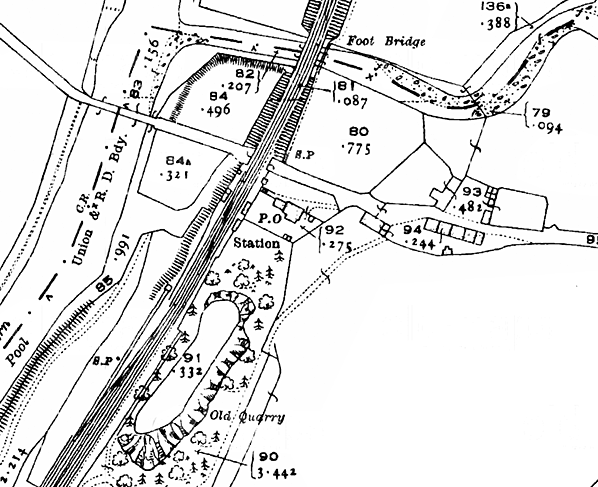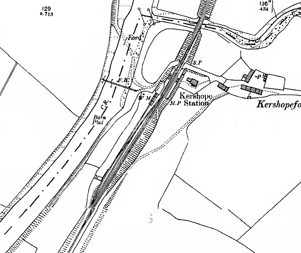 Initially there was no level crossing (see 1901 map below). The track went under the line at the station then crossed the Liddel Water by a ford with a pedestrian footbridge alongside. In the early 20th century the ford was replaced by a bridge and level crossing was provided at the north end of the station. The 1901 map also shows that the line was single track south of the station and double track north of it.