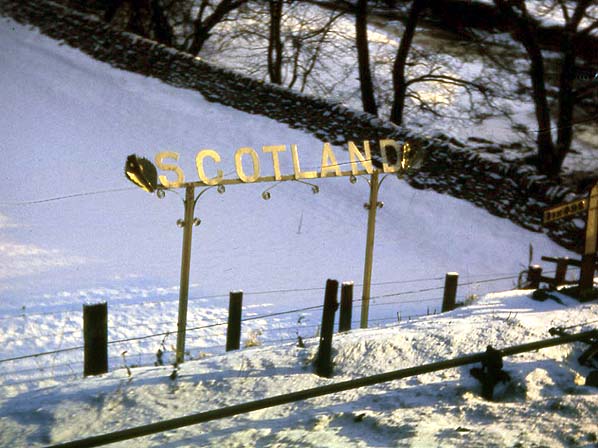 Border sign on the east bank (north side) of the Kershope Burn in January 1963.