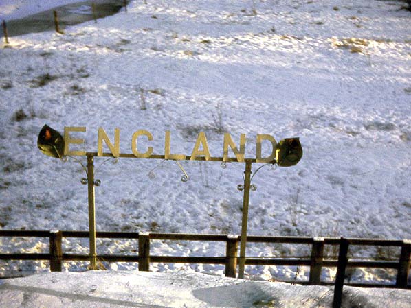 Border sign on the east bank (south side) of the Kershope Burn in January 1963.