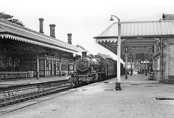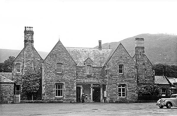 ![]() The dignified Gothic forecourt elevation of Keswick station with its steep gables is seen looking north-east in September 1950. The small awning over the entrance, installed by the LMS to replace a larger, double hipped one, carries the words ‘LMS KESWICK’ in delicate, decorative metal letters - over two years after the British Railways era began. Latrigg (1203ft) can be seen in the background.
