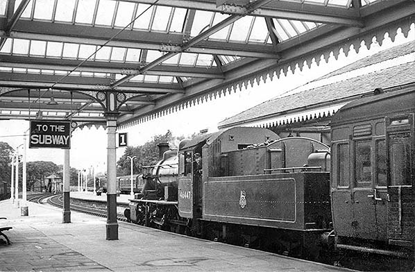 ![]() No.46447 waits at the down platform of Keswick station on a passenger train bound for Workington (Main) in September 1950. The Ivatt-designed Class 2F 0-6-0 was built at BR Crewe works in March 1949. The loco remained in service until December 1962. She is preserved at the Buckinghamshire Railway Centre.