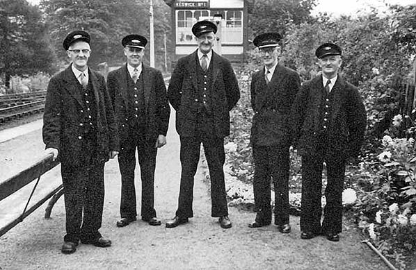 Photo by H C Casserley ![]() Stationmaster Jackson Armstrong (second right) and four of his staff from left to right: Harry Hayes, Harry Worthington, Richard Scott and Johnny Rigg pose for the camera at the north end of the down platform in 1956. Jackson Armstrong was the last Stationmaster/Goods agent appointed to Keswick and was in office from 1955 until 1964.