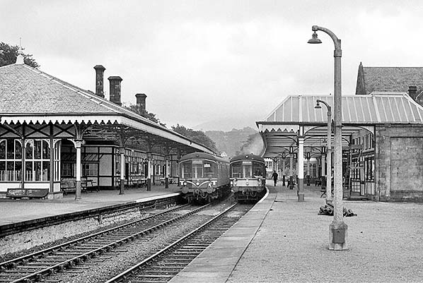 Photo from John Mann collection ![]() Keswick station with trains for Penrith (left) and Workington (right) on 31 July 1962.
