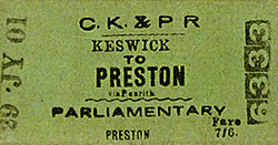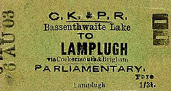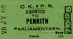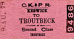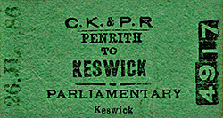 Photo by H C Casserley ![]() Platform 1 (the down platform) of Keswick station looking east in September 1950. The ample platform roofing, glazed over the down platform and slated over the island platform, provides shelter for passengers. The contrast between the original stone building (right) and the later timber structure on the island platform will be noted. The efficient, but unsightly, concrete lamp standard is one of those installed either by the LMS in its later years, or by BR. The westbound passenger train is headed by No.46447, an Ivatt-designed Class 2F 0-6-0, built at BR Crewe works as recently as March 1949. The loco remained in service until December 1962. She is preserved at the