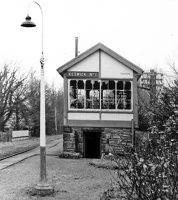 ![]() The derelict Keswick No.1 (formerly 'B') signal box looking east on platform 1 in February 1972. This LMS box was installed in 1932 and closed on 4 December 1967 when single-line working was introduce,