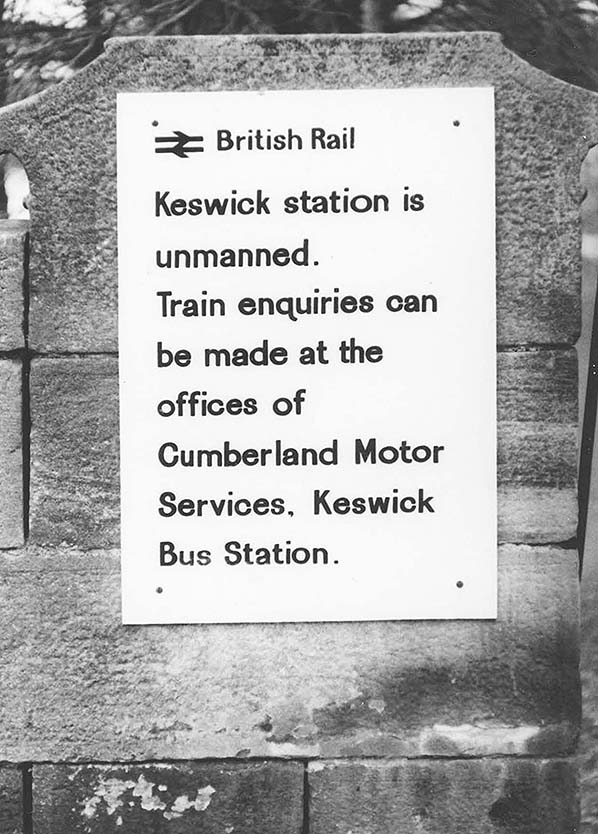Photo from John Mann collection ![]() Keswick and the other branch stations ceased to be staffed in July 1968. Ironically, intending rail passengers are referred to the bus station for rail information! Note that the station is ‘unmanned’ – the term commonly used regardless of the fact that women were employed on the railways. The photo was taken in February 1972, shortly before closure.