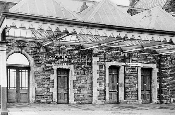 Photo from John Mann collection ![]() The entrance to Keswick station photographed in February 1972, shortly before closure. The main station building, seen here, stands on the down platform – the only one in operation – so rail users pass through it even though the building itself is no longer in use, staff and booking facilities having been withdrawn in July 1968. Above the small awning the charming metal lettering giving the station name is still in place, although ‘LMS’ seen on a 1950 photograph is no longer displayed. In earlier days a much larger, double hipped awning sheltered the entrance.