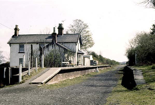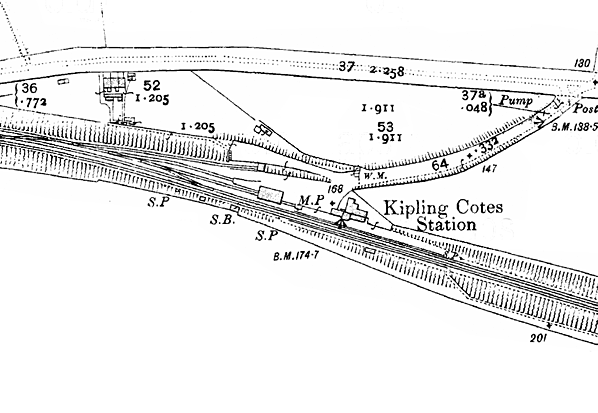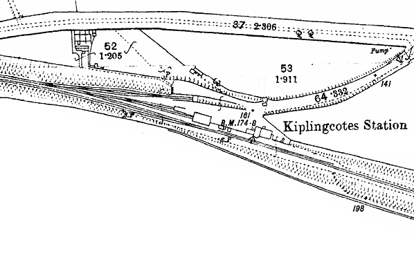Present state: | The Hudson Way footpath and cycleway passes through the station, with a public car park for access to the path. All the station buildings, including the cattle dock, survive in good condition although the house has been extended. The signal box has been restored as an information centre for the Hudson Way. The goods shed is now a furniture shop trading as Kiplingcotes Furniture. Both platforms survive. There is a modern nameboard in place on the down platform. There is fencing along the middle section of the down platform. The up platform is overgrown but the concrete supports for its name board survive. An overgrown platelayer's hut stands on the up side of the line just to the east of the signal box. This is shown on both the 1891 and 1910 maps below. |