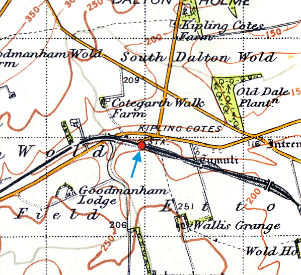 Notes: The Market Weighton - Beverley line opened on 1st May 1865, but although it is assumed Kipling Cotes opened with the line there is no documentary evidence to confirm this. Early in January (possibly 11th) a special train travelled along the line taking magistrates and others to the East Ridings Sessions at Beverley. This might have been the first train to stop at Kipling Cotes, but there are no details of stops, if any. C T Goode states in his book The York Beverley & Market Weighton Railway that the station was originally called Dalton Holme – the name of an adjacent parish, north of the station - but there are no references to use of this name from normally reliable sources (Quick, Clinker etc). There is no village of Dalton Holme (although there is a South Dalton) and there is no village of Kipling Cotes, only several farms and houses, so it is unclear why a station was actually built here. It was used by Lord Hotham and visitors to Dalton Hall. According to Ordnance Survey the station was originally Kiplingcotes, but by 1910 this had become Kipling Cotes although the former name was often still used. Kipling Cotes was one of the few stations not to have a level crossing, and access to the goods yard was controlled by a ground frame. There were three sidings accessed from the east. One of these had a loop; the middle siding stopped end on to the cattle dock, and the third siding passed in front of the cattle dock and then immediately entered a brick goods shed at the west end of the platform. There was also a 2-ton crane. When the line was doubled in 1899, the layout of the goods yard was changed to give access from both directions. The loop on the northernmost siding was removed, and a shunting neck was added. A second facing platform was built, and this was provided with timber waiting shelter, built to the standard NER design. At this time the ground frame was replaced with a brick signal box on the up side of the line, opposite the cattle dock. Until closure of the line, the only way that passengers could reach the up platform was by using a barrow crossing at the east end of the station. The NER always kept the station in good condition so that it could be used for such purposes as the promotion of new rolling stock. In 1911 the population of the station’s catchment area was only 127. Despite this 3,011 tickets were sold that year, and the main freight handled was barley with a respectable 591 tons being dispatched. In 1913 103 wagons of livestock were loaded at the station. There was an abortive attempt to close Kipling Cotes in 1958; the station was downgraded to an unstaffed halt.on 12th June 1961, but ‘Halt’ was not added to its name. Although goods traffic was still handled, the station became an unstaffed public delivery siding until 27th January 1964 when the goods service was withdrawn. While the next station, Cherry Burton (which had a catchment area population of 1154 in 1911) closed in 1959, Kipling Cotes remained open to passenger traffic until closure of the line from 29th November 1965. After closure Tessa Uttley, who ran the tea room at Market Weighton, moved into the station house and opened a tea room. Today the station is home to a furniture business with the goods shed used as a furniture shop. It was not long, however, before the arrival of railways would ensure the rapid decline in waterborne transport in the area. The Leeds & Hull Railway Company was formed in 1824 with George Stephenson appointed as engineer. He proposed three inclined planes to be worked by three stationary engines for the hilly route out of Leeds, but the remainder of the line was very nearly level. This L&HR was one of a number of contemporary projects aimed at linking the east and west sides of northern England. The Leeds & Hull scheme soon stagnated, due in part to the stock market crash of 1825. In the meantime, the Knottingley & Goole Canal opened in 1826, turning Goole into a viable transhipment port for Europe. The growth of Goole as a port to rival Hull was sufficient to spur the Hull-based shareholders of the Leeds & Hull railway into action. At the end of 1828, they motioned that the railway should be built as far as Selby, with the remainder of the journey to Hull being made by steam packet, most importantly, bypassing Goole. The shareholders passed the proposal at a general meeting in Leeds on 20th March 1829, and the Leeds & Selby Railway Company was formed. The shortened line from Leeds to Selby was resurveyed by James Walker in 1829; he reported that the stationary engines were not required, with tunnels and cuttings being built in their place. Despite strong opposition from the Aire & Calder Navigation, who had a practical monopoly on transportation in the area, a Bill was passed by Parliament on 29th May 1830 allowing construction of the double-track line. By 22nd September, a single complete line of track had been built, and the railway was officially opened to passengers from a temporary terminus adjacent to the quayside at Selby. Both lines were complete by 15th December 1834, on which date the railway began to take goods traffic.