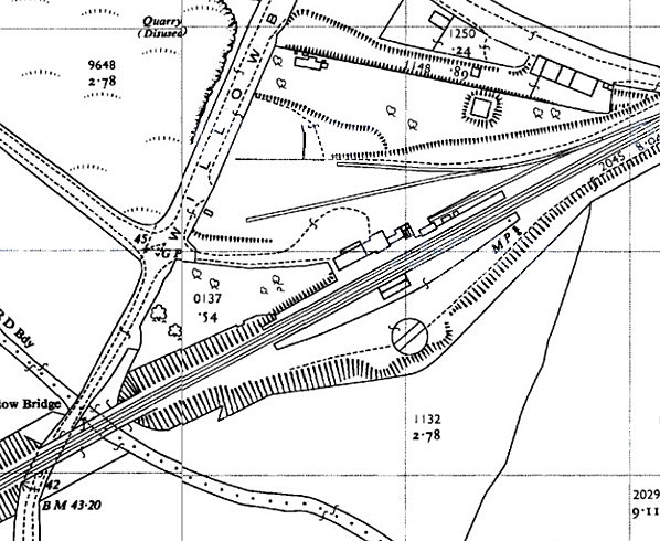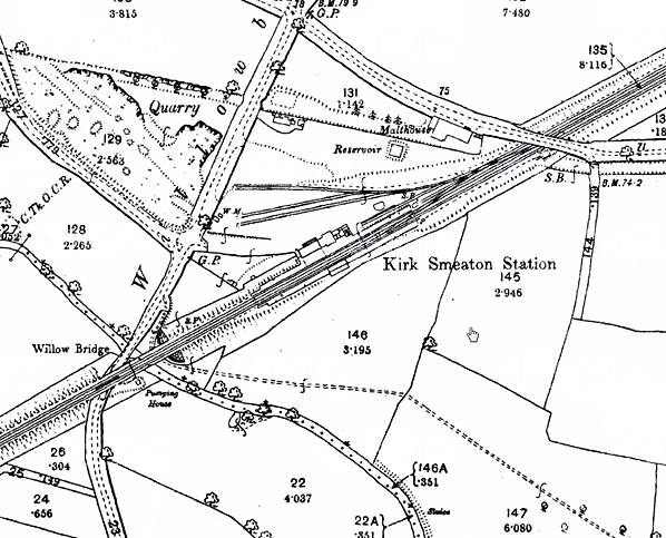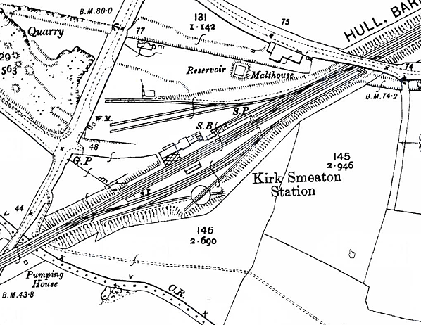 A signal box was at the east end of the down platform. This controlled access to the goods yard which had four sidings, the shortest of which ran behind the down platform. The other three fanned out across the yard running behind the station buildings. There was no goods shed. In the 1890s the up platform became an island and a turntable was provided behind the up platform for the use of locomotives operating the passenger service between Wath and Kirk Smeaton (see Bradshaw below). It may also have been used by banking engines required for the steep climb from Kirk Smeaton to Wrangbrook Junction to the west of the station. The signal box was replaced at the same time by a new box on the down platform a little to the east of the station building.