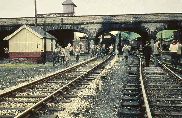 Northern Fells Railtour at Kirkby Stephen East Station on 29th May 1960. The entrance to the station is visible on top of the bridge.