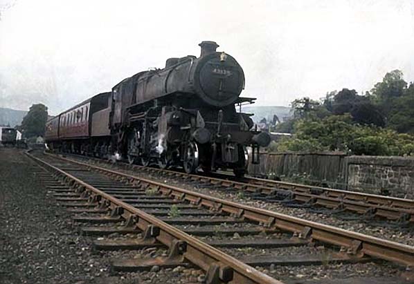 ![]() An LMS, Ivatt designed 4MT, 2-6-0 working a Class B stopping train leaving Langholm station in 1960s. This class was sometimes known as a 'Doodlebugs' or 'Flying Pigs' due to the ugly high running plate.