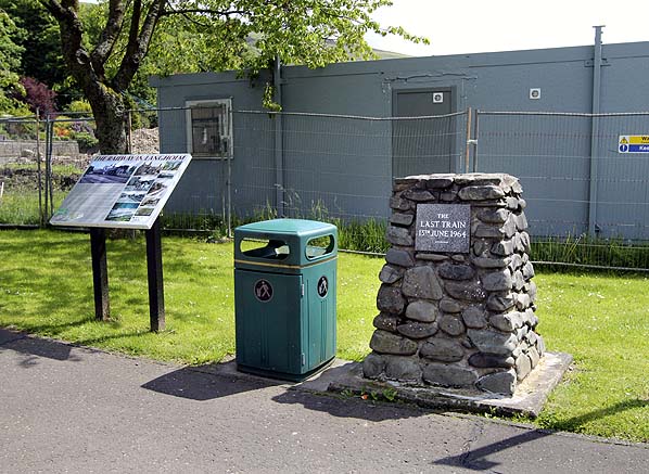 Commemorative cairn erected close to the site of Langholm station in May 2011. An interpretation panel is seen on the left. Click