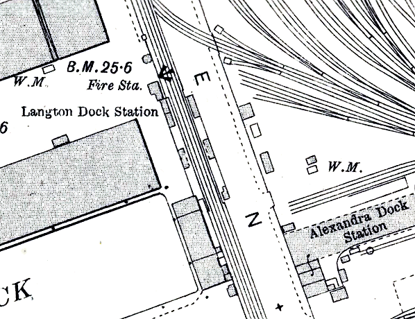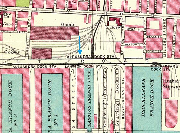 Langton Dock station was not one of the original stations on the line opening by May 1906. It was on the west side of Regent Road on the east side of the dock system. In common with the other stations on the line it was elevated above the street and had the Mersey Docks & Harbour Board (MD&HB) railway running underneath. Passengers accessed the station by stairways. There were two platforms and shelters were provided on both. Ticket facilities were located on the platforms.