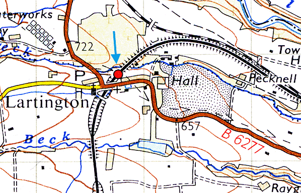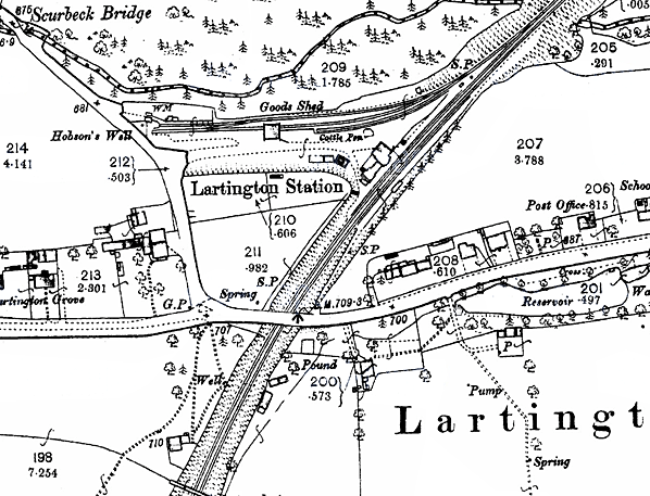 The station had two platforms with the main station building and stationmaster's house on the up platform and a brick waiting shelter on the down platform. The station had two sidings including a loop running alongside the access road to the station with a goods shed, office and coal drops half way along the sidings. A third shorter siding terminated at a cattle dock and cattle pens behind the stationmaster's house. A ground frame controlled access to the goods yard. Lartington West box controlled access to quarries south of the station. The box was out of use by WW1 but still stands alongside the trackbed.