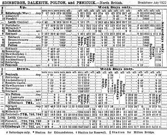 In 1887 there were six daily trains in each direction between Edinburgh Waverley and Polton. There was, however, no early morning train: the first departure from Edinburgh was at 9.25am with a journey time between Eskbank and Polton of 12 minutes. There was no Sunday service. By 1922 there was one additional service leaving Edinburgh at 7.00am |
