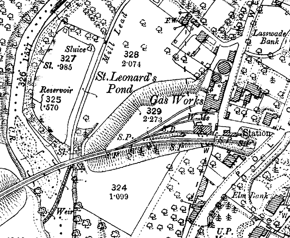 There was a moderate-sized goods yard to the rear of the platform, accessed from the west. The yard comprised four short sidings; one running behind the platform went into a stone-built goods shed with a hipped slate roof. The yard, which did not handle livestock, included a 1 ton 10cwt crane. Lasswade gas works was immediately north of the goods yard, with St Leonards Paper Mill (closed 1965) a short distance to the north along Westmill Road; both would have used the railway. Access to the goods yard was controlled by a signal box behind the platform near its west end. The box had gone by the 1930s.