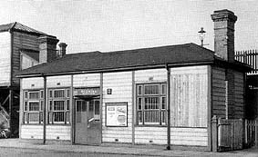 The second Latchford station was constructed of timber and far less imposing than its predecessor. The main entrance was set back from Station Road adjacent to the line but at a slightly lower elevation. It was a modest, rectangular single-storey structure under a hipped roof with a tall chimneystack. Behind the building there was a subway which connected to the up platform. A set of covered steps connected to the down platform.