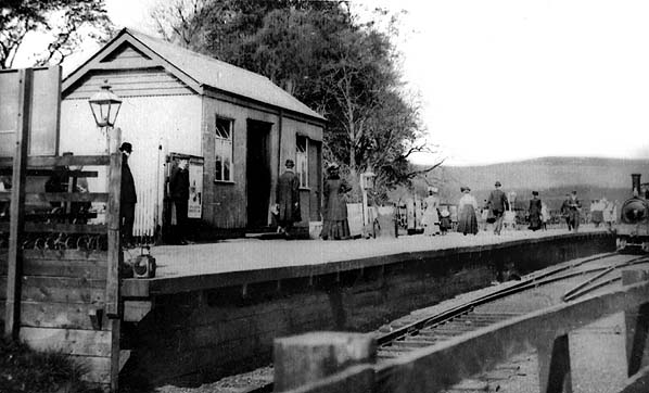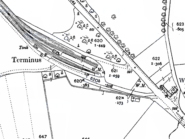 Lauder station had a single platform built of cinders and timber with a run-round loop on the down side of the line. There was a small timber building with a pitched roof that housed the booking office and a small waiting room. A small goods yard comprising two sidings was entered from the loop. One siding served a large cattle dock while the other served a timber goods shed clad with corrugated iron sheeting and a curved sheeted roof. A canopy protruded over the track. A one-road engine shed for the branch locomotive was opened with the line, situated between the sidings and the loop at the north end of the cattle dock, with a locomen’s bothy behind it. A water tank on a timber tower stood on the down side of the line to the north of the station.