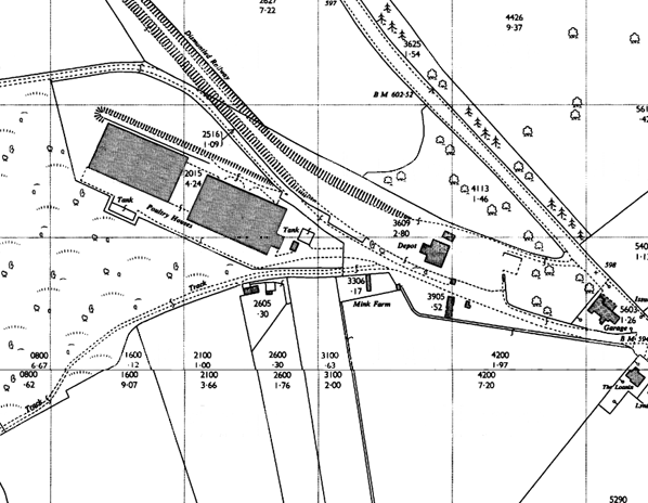 After passenger services were withdrawn in 1932 the engine shed was closed and quickly demolished, and the signals were removed. During WW2 a buffer food depot consisting of two three-bay sheds was built. It had a storage capacity of 6,000 tons of staple foodstuffs, away from the threat of bombing. There was a trailing siding into the depot from the main line just north of the platform. The depot continued to function after the war as it was still considered strategically important during the early years of the ‘cold war’.