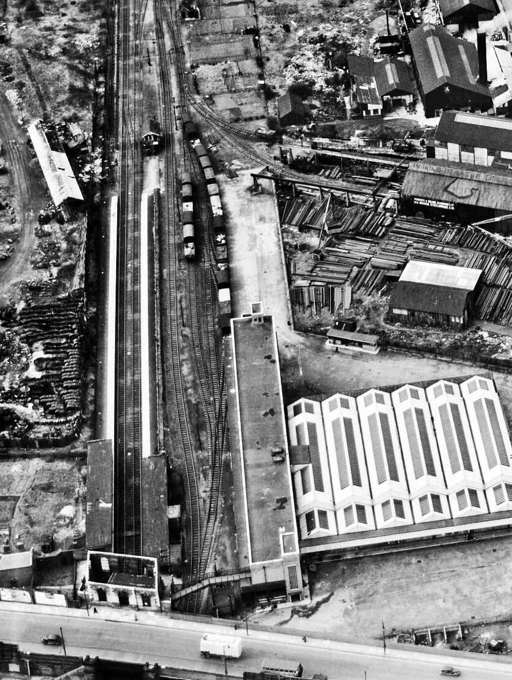 Aerial view of Lea Bridge station from the south in April 1947. The street-level building was gutted by fire on 31 March 1944 and is seen here as a blackened shell. The staggered platform shelters are seen, the angle of the stagger matching the angle of the road in relation to the line. Lea Bridge signal box and junction is seen north of the up platform. Bottom right is the recently-built goods and parcel depot which was constructed partially on the site of the disused GER telegraph works. Note the high-level staff walkway linking the depot with the street-level station building. North of the goods depot is H Young & Co's steel fabrication works which moved onto the site of the cast stone works in 1939 following an air raid which destroyed Young's works at Nine Elms. The works are served by four sidings from Lea Bridge Junction. The sign on the side of the building reads ‘Powers and Deane Ransome's Co. Lea Bridge Steelworks. E10’. On the left, one of the stands of the abandoned Lea Bridge Stadium is seen. Part of the stationmaster's house is seen bottom left, next to the station building.