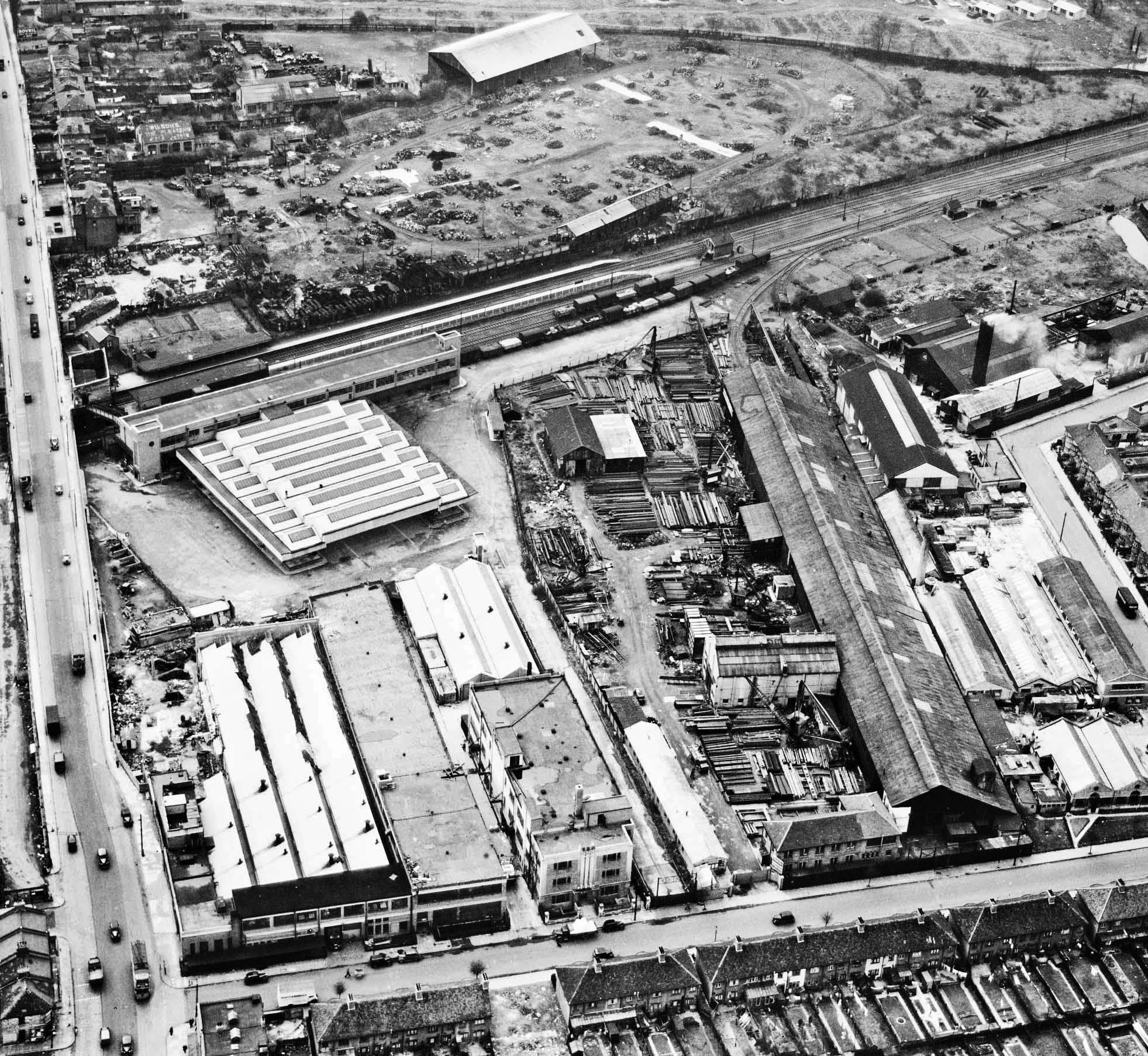 Aerial view of Lea Bridge station from the east in April 1947. Lea Bridge Road runs along the left edge with the burnt-out and blackened shell of the station building clearly visible. The recently-constructed good/parcels depot is seen to the east of the station. Despite a number of vans in the sidings the yard is devoid of any activity with no vehicles visible. To the right the steel yard appears to be well stocked. The remains of Lea Bridge Stadium are seen at the top; the two stands are still there but the terracing a and track have been removed to allow the site to be used as allotments as part of the war effort. Further allotments are seen on railway land to the north of Lea Bridge Junction. There are some interesting buses on Lea Bridge Road. Towards the bottom of the picture and heading east is a trolleybus. Between the trolleybus and the station, also heading east, is an LT class double-decker. Heading west and about to pass the station is an open-staircase bus, either of the LT or ST class. It appears to be an ST. In 1947 the LT and ST classes had only a couple of years left before they were replaced by the RT types. The surviving open-staircase buses had enjoyed an extended life owing to the war.